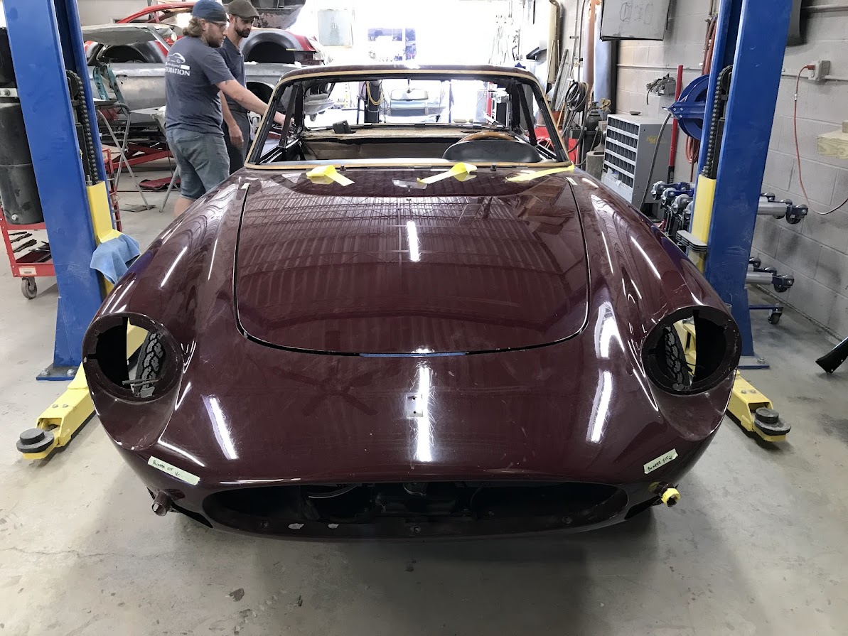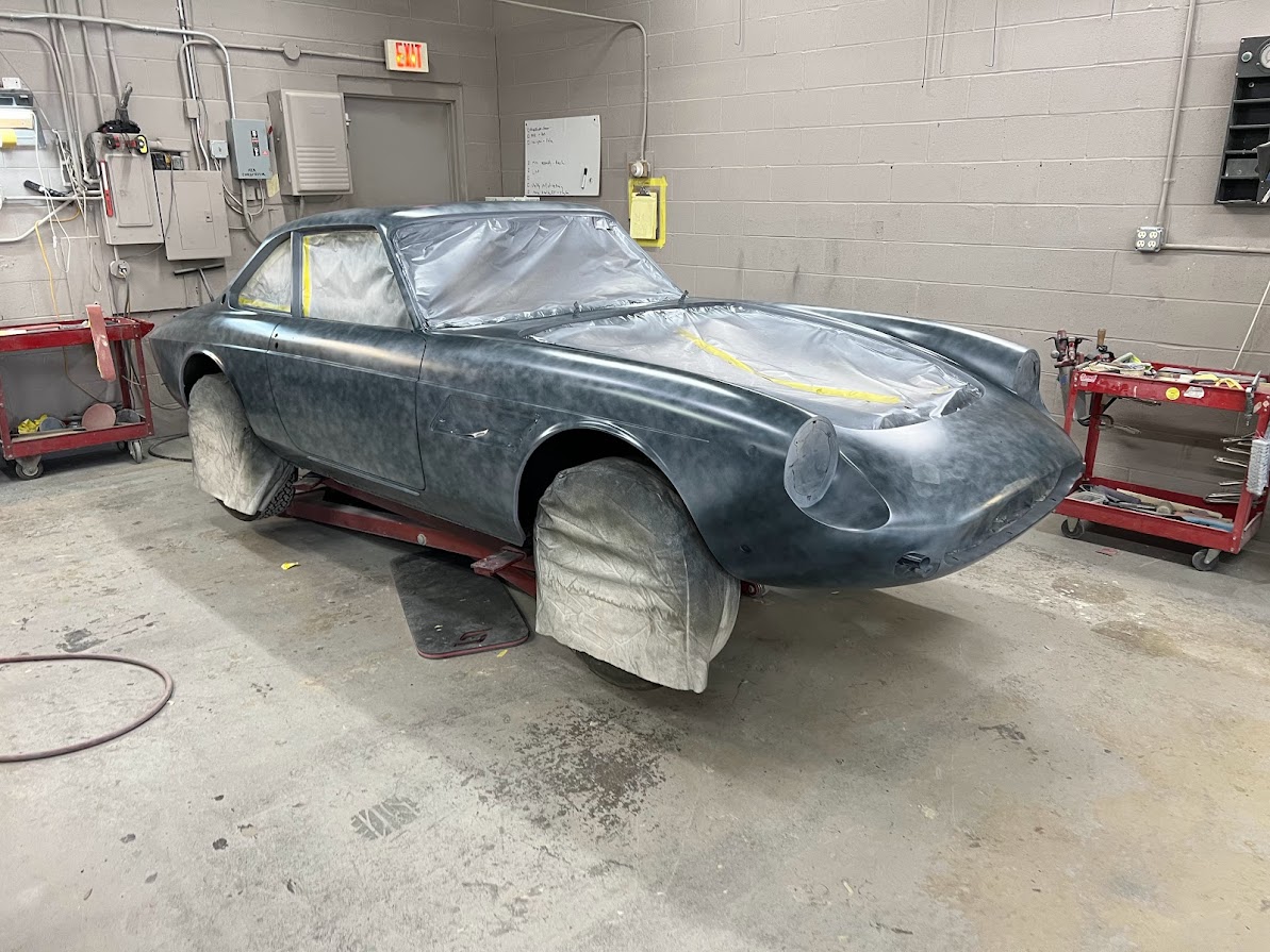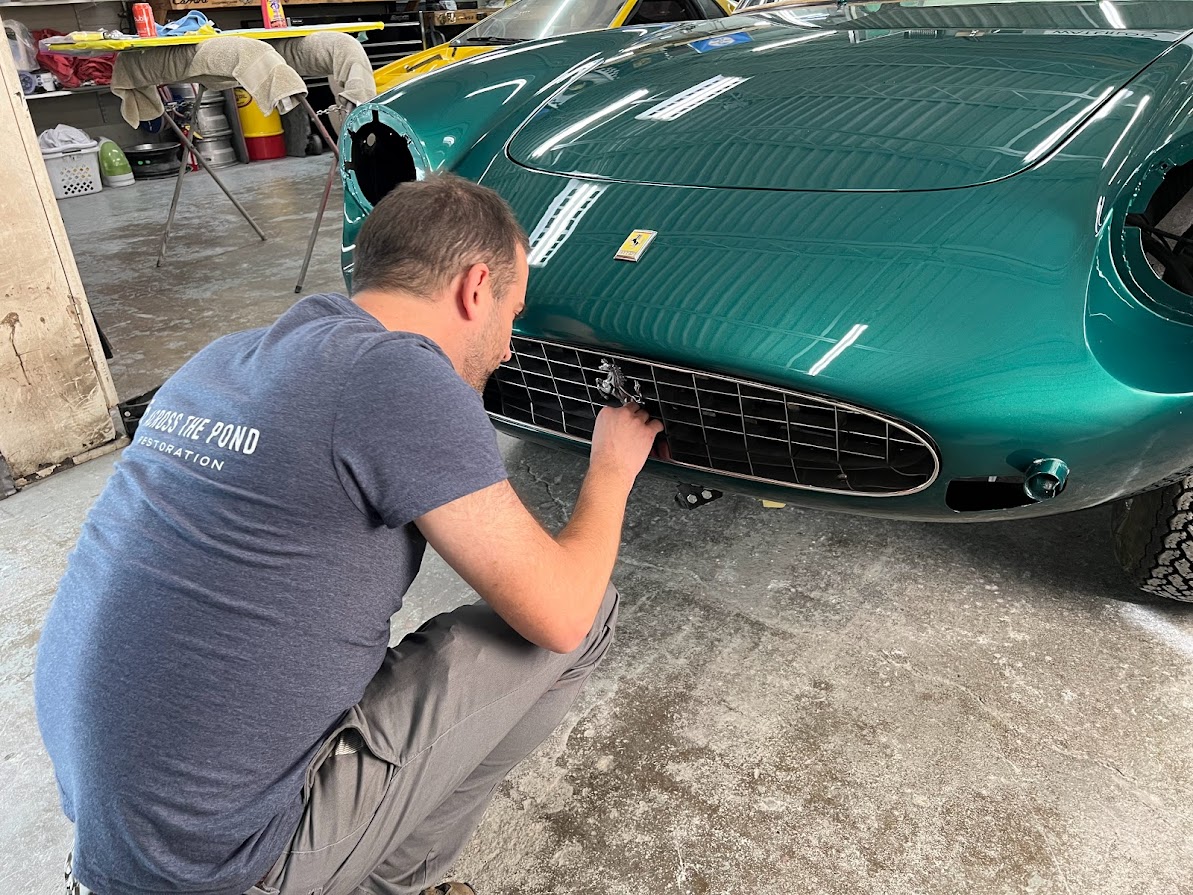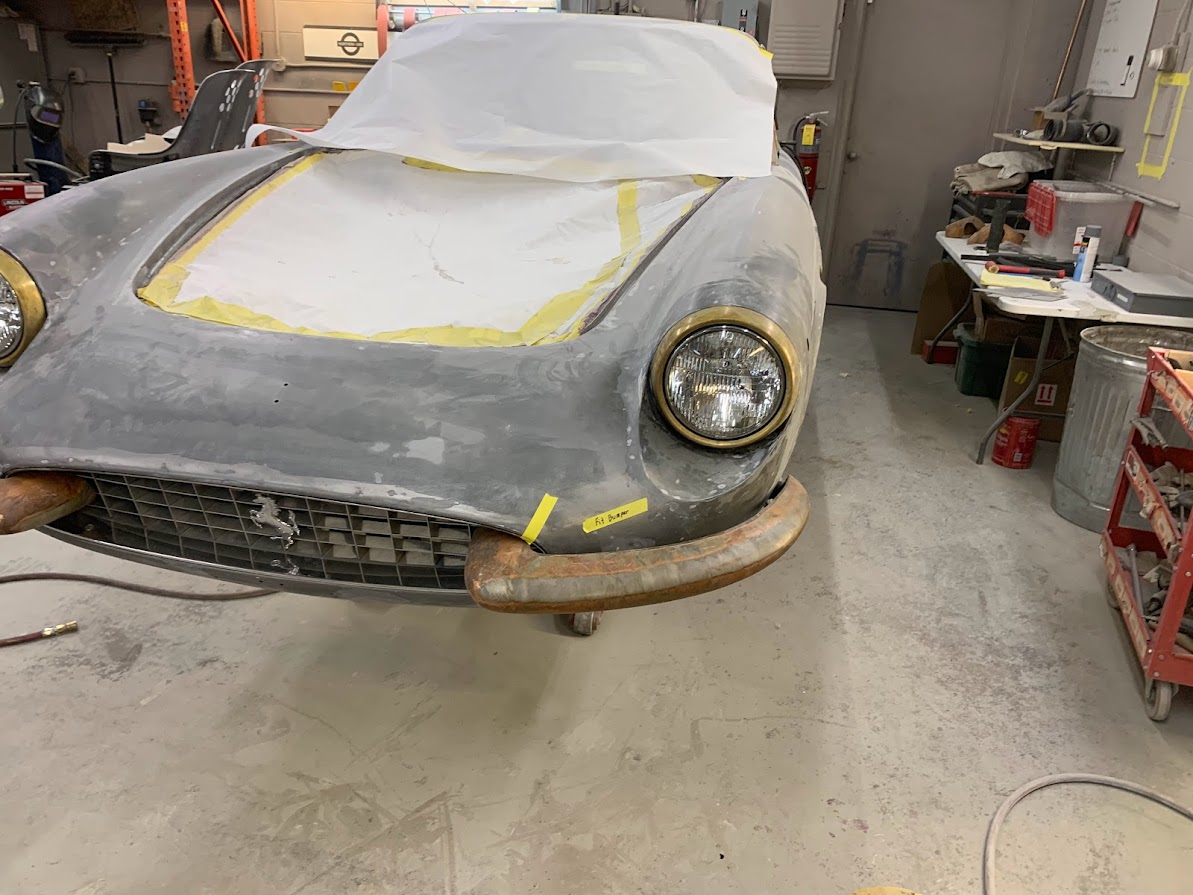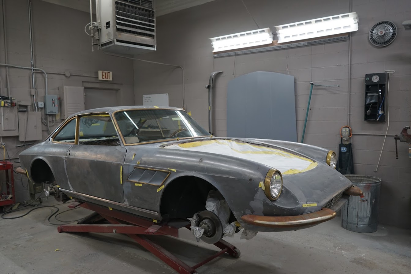 We received the 1967 Ferrari 330 GTC from Randy at R&R Automotive Restorations. The car had been repainted at some point, so we stripped it down to bare metal. Randy had left several notes on areas he wanted improved—tightened panel gaps, better fitment, and metalwork corrections. One of the major tasks was the driver's side door. The entire door was in poor condition, so we fabricated a new doorskin using the English wheel and welded it in. We also had to rebuild the hinge assembly and lead the door gaps for a proper fit. This car required extensive leadwork. Due to the hand-built nature of the coachwork, the components were highly inconsistent—quarter windows, bumpers, trim—all needed adjustment. We reshaped and fit the bumpers individually, as the left and right sides were not symmetrical. Each bumper was shaved and contoured to match the body exactly. We also ensured proper fitment of all glass, headlights, side vent trim, and the front grille. Once all metalwork and leadwork were completed, we painted the car. To verify proper fit, we pre-assembled all components—including door handles, window frames, headlights, and trim—prior to plating and chroming, ensuring tight and consistent gaps. After bodywork and paint were complete, the car returned to Randy for mechanical sorting and final interior work.